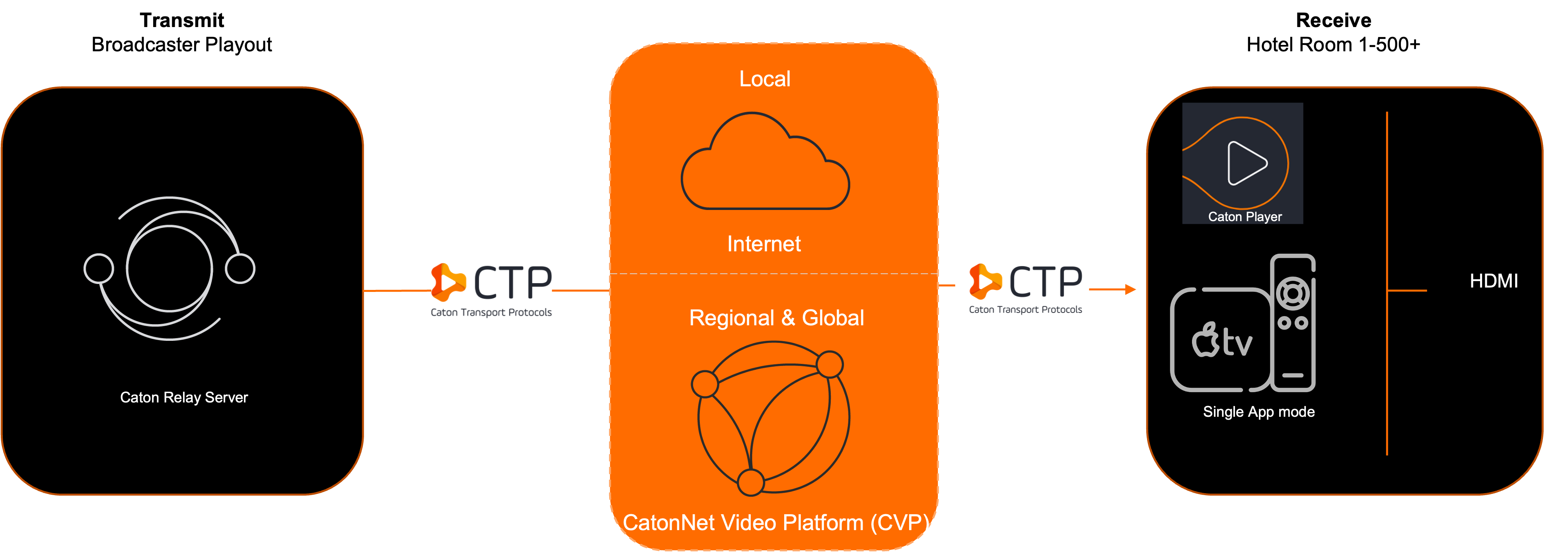 為向飯店及其他大樓的終端用戶提供服務,該專案還包含 Caton Player 這款行動串流應用程式,專為播放高品質內容的硬體(如 Apple TV)而設計。Caton Player 還可透過自動容錯切換功能,在發送端出現任何中斷時確保影像播放的連續性。